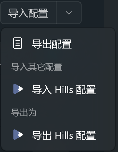 小幻影视与 Hills 达成合作,如果你正在同时使用小幻影视和 Hills,那么你可以导入或导出 Hills 配置,以快速完成双端的数据迁移。